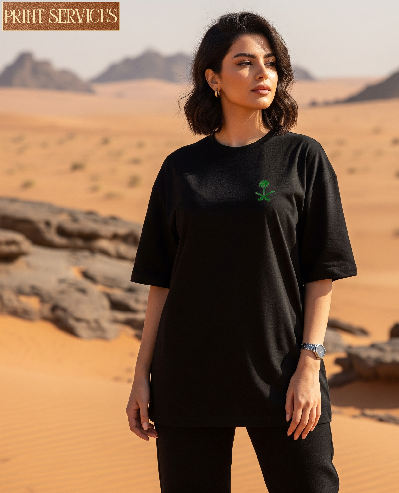 - تيشرت اوفر سايز طباعة بتصميم خاص مستوحى من اليوم الوطني، يجمع بين الراحة والفخامة، ويعكس الانتماء الوطني بروح عصرية أنيقة، ليمنحك إطلالة مميزة معبرة عن الفخر.