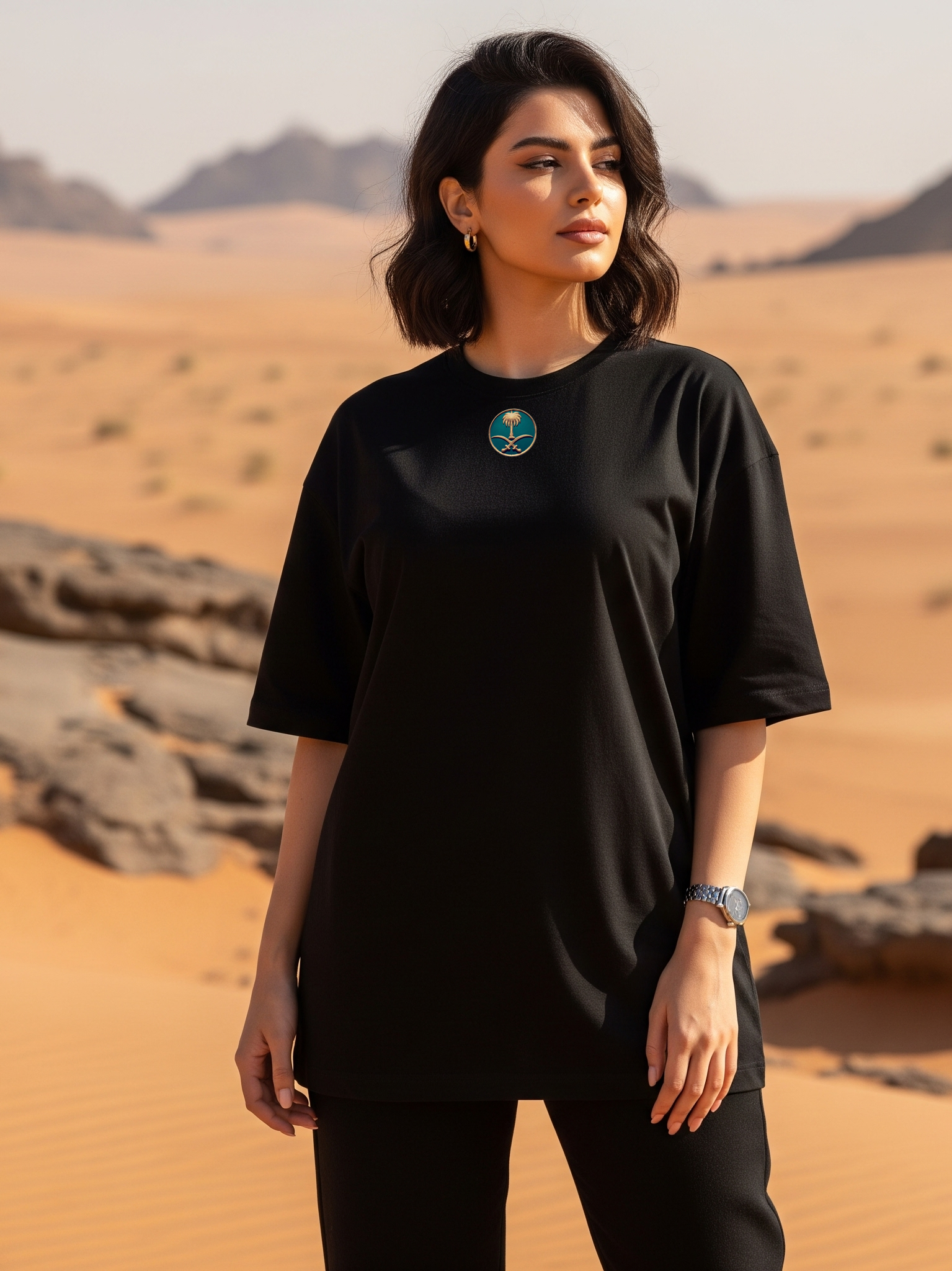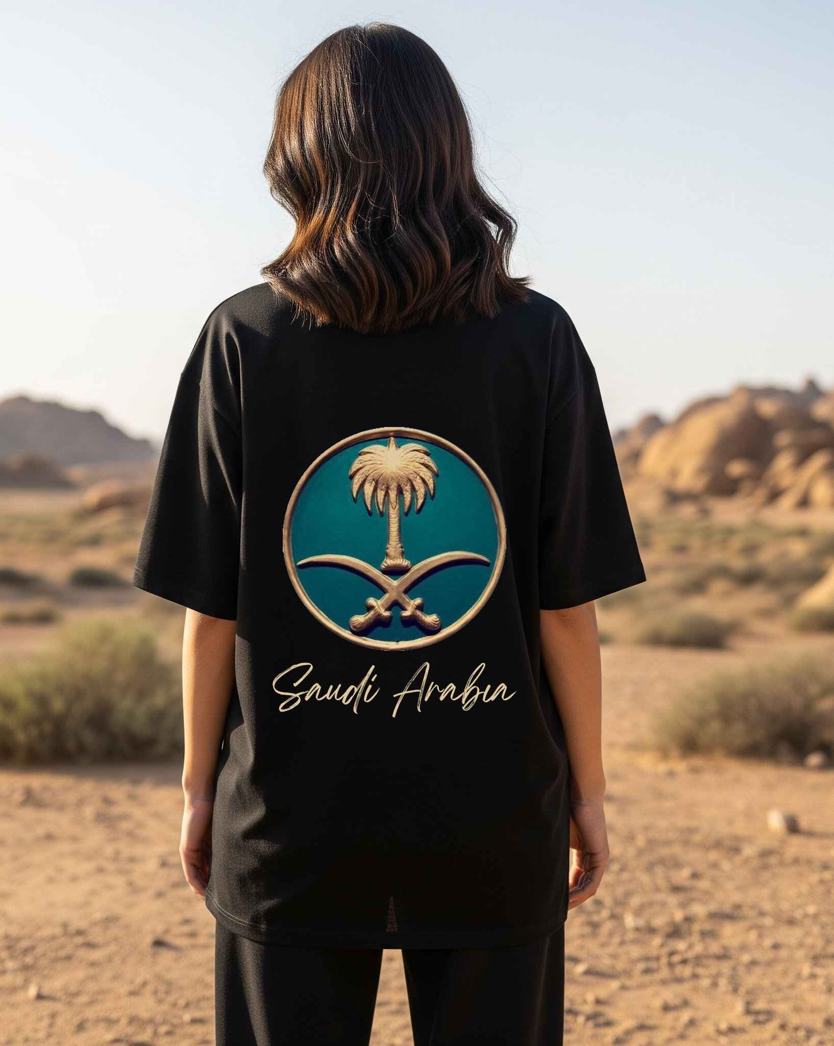 - تي شيرت اليوم الوطني أوفر سايز أنيق باللون الأسود مطبوع عليه شعار السيفين والنخلة، يعكس روح اليوم الوطني ويمنحك مظهرًا عصريًا مميزًا يجمع بين الفخر والراحة.