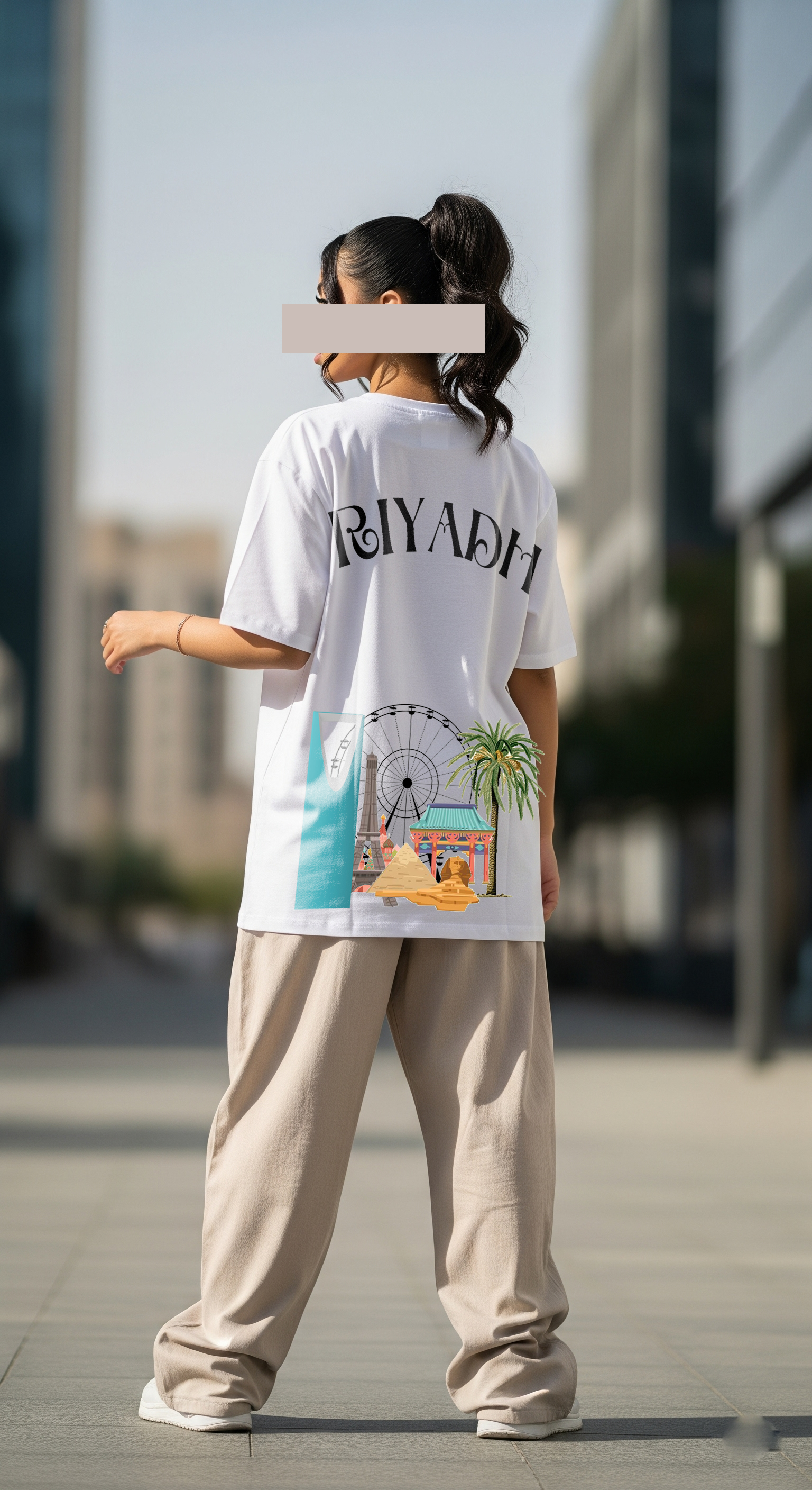 - تي شيرت بناتي اوفر سايز بطباعة الرياض احتفالاً باليوم الوطني، يجمع بين البساطة والأناقة ليمنحك مظهراً مميزاً يعكس الفخر والانتماء بروح عصرية مريحة.